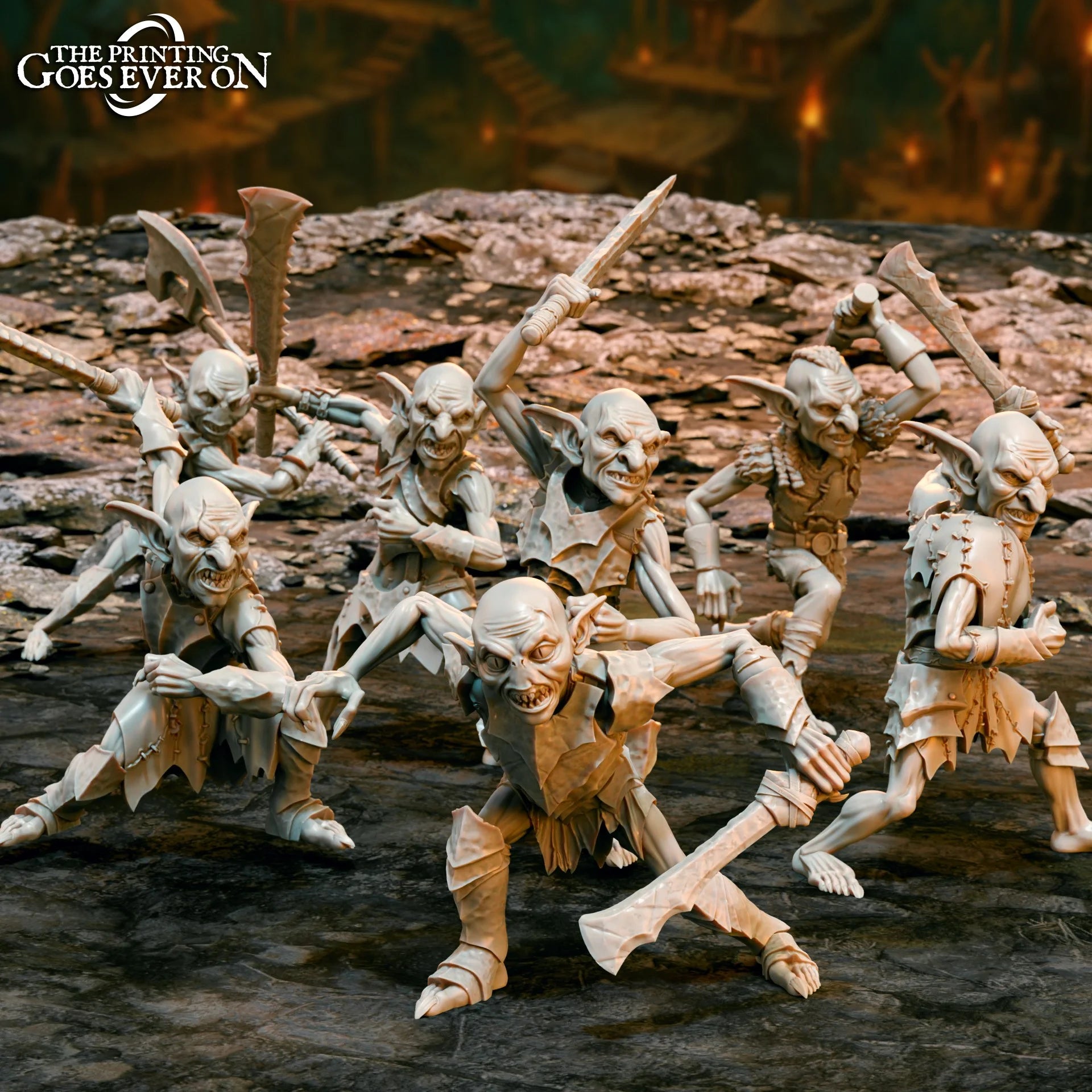 9 Goblin Fighters y un Denmaster Impresos a escala de 28 mm en resina, perfectos para un determinado escenario de fantasía que sigue a 9 aventureros en una búsqueda para destruir un poderoso anillo mágico.