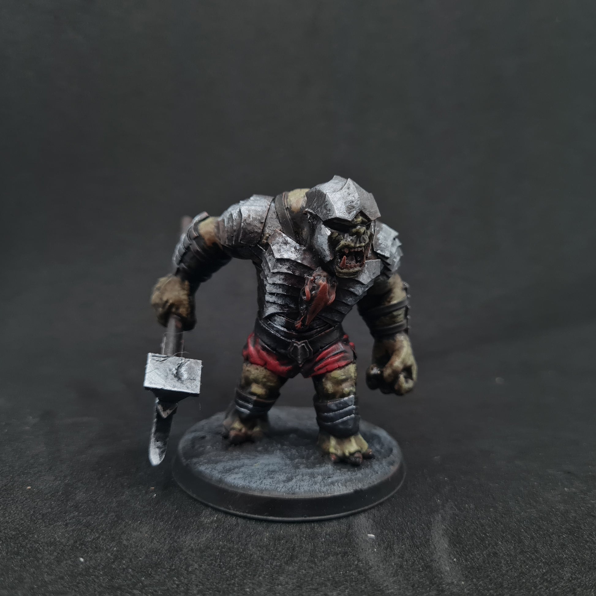 Un Troll de Guerra Blindado impreso a escala de 28 mm en resina, perfecto para un determinado escenario de fantasía que sigue a 9 aventureros en una búsqueda para destruir un poderoso anillo mágico. Ejemplo pintado en fotos.