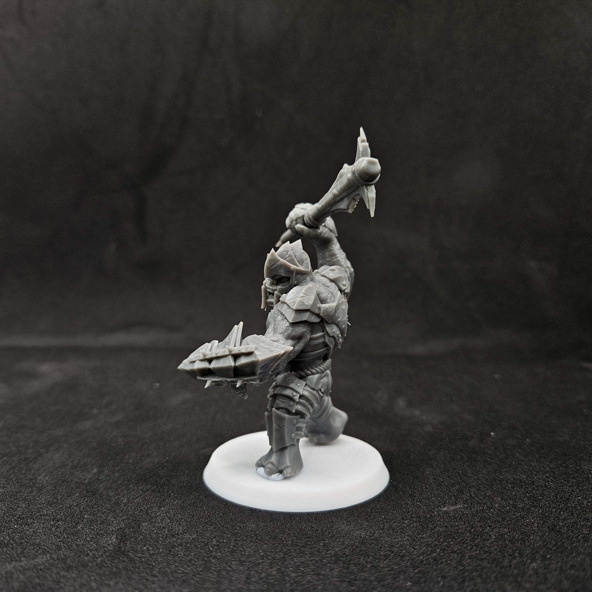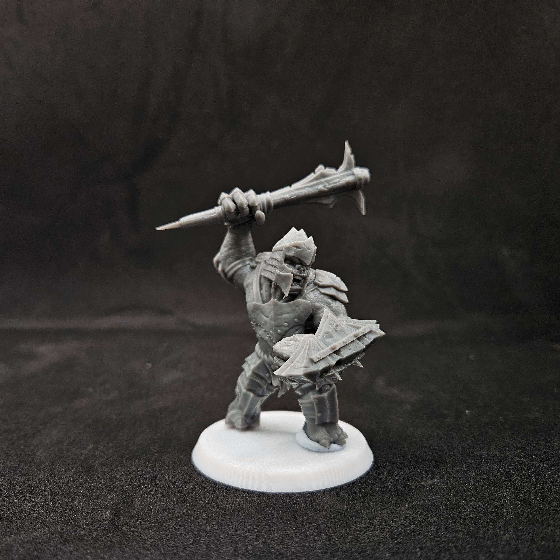 Un Troll de guerra blindado con maza impreso a escala de 28 mm en resina, perfecto para un determinado escenario de fantasía que sigue a 9 aventureros en una búsqueda para destruir un poderoso anillo mágico.