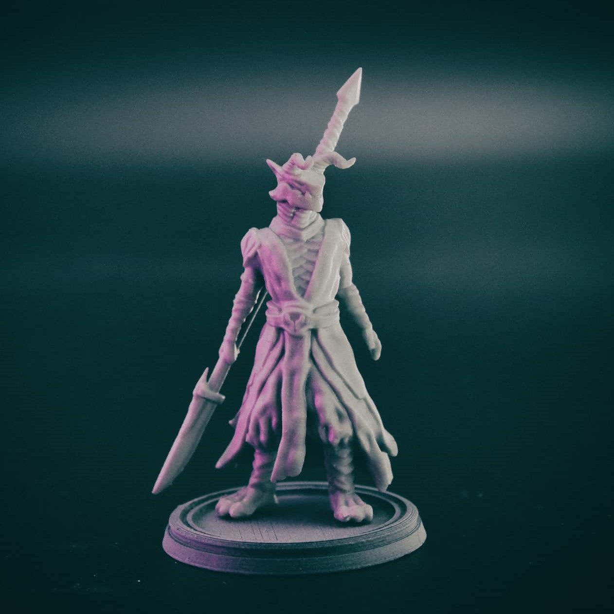 Dragonborn Warrior impreso a escala de 28mm en resina, perfecto para una determinada ambientación de fantasía.