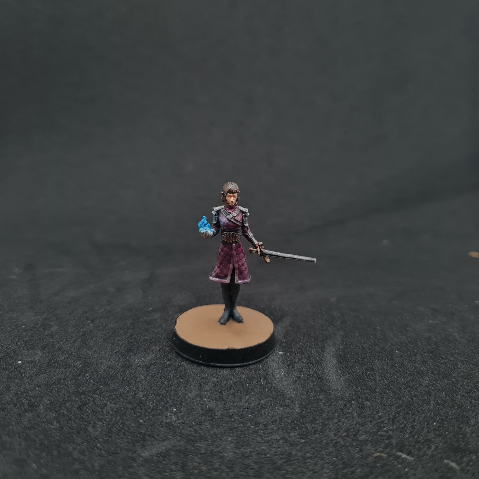 Jilsa Rennwin una bruja semielfa impresa a escala de 32 mm en resina, perfecta para cualquier ambientación RPG de fantasía del DND es un set de miniaturas de mujer. Ejemplo pintado en fotos.