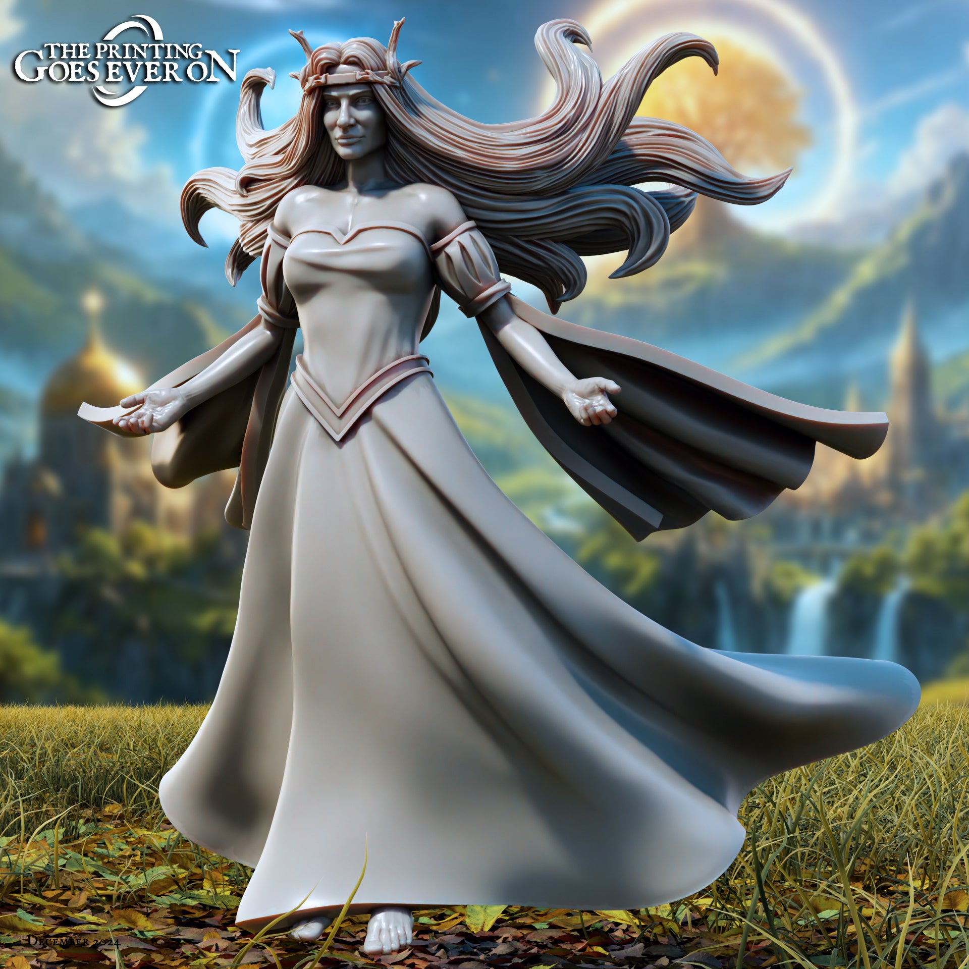 La reina Gladhiel en 2 poses impresa a escala de 28 mm en resina, perfecta para un determinado escenario de fantasía que sigue a 9 aventureros en una búsqueda para destruir un poderoso anillo mágico.