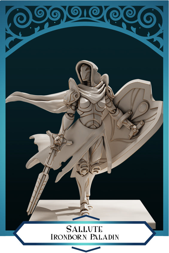 Sallute una Paladín Ironborn femenina impresa a escala 32mm en resina, perfecta para cualquier ambientación RPG de fantasía del DND es un set de miniaturas de mujer.