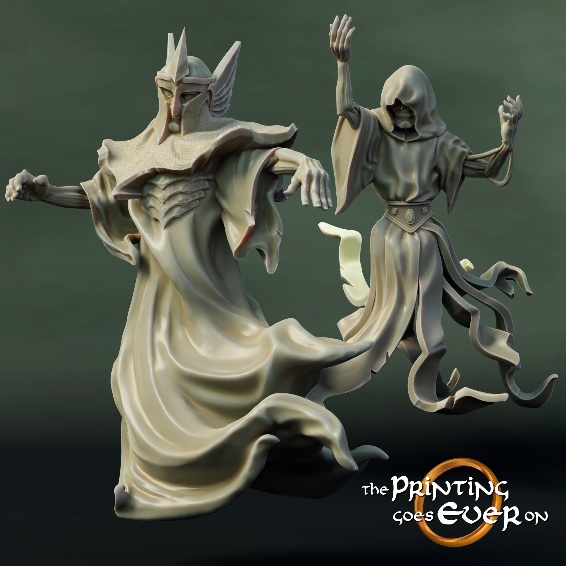 2 Espectros impresos a escala de 28 mm en resina, perfectos para un determinado escenario de fantasía que sigue a 9 aventureros en una búsqueda para destruir un poderoso anillo mágico.