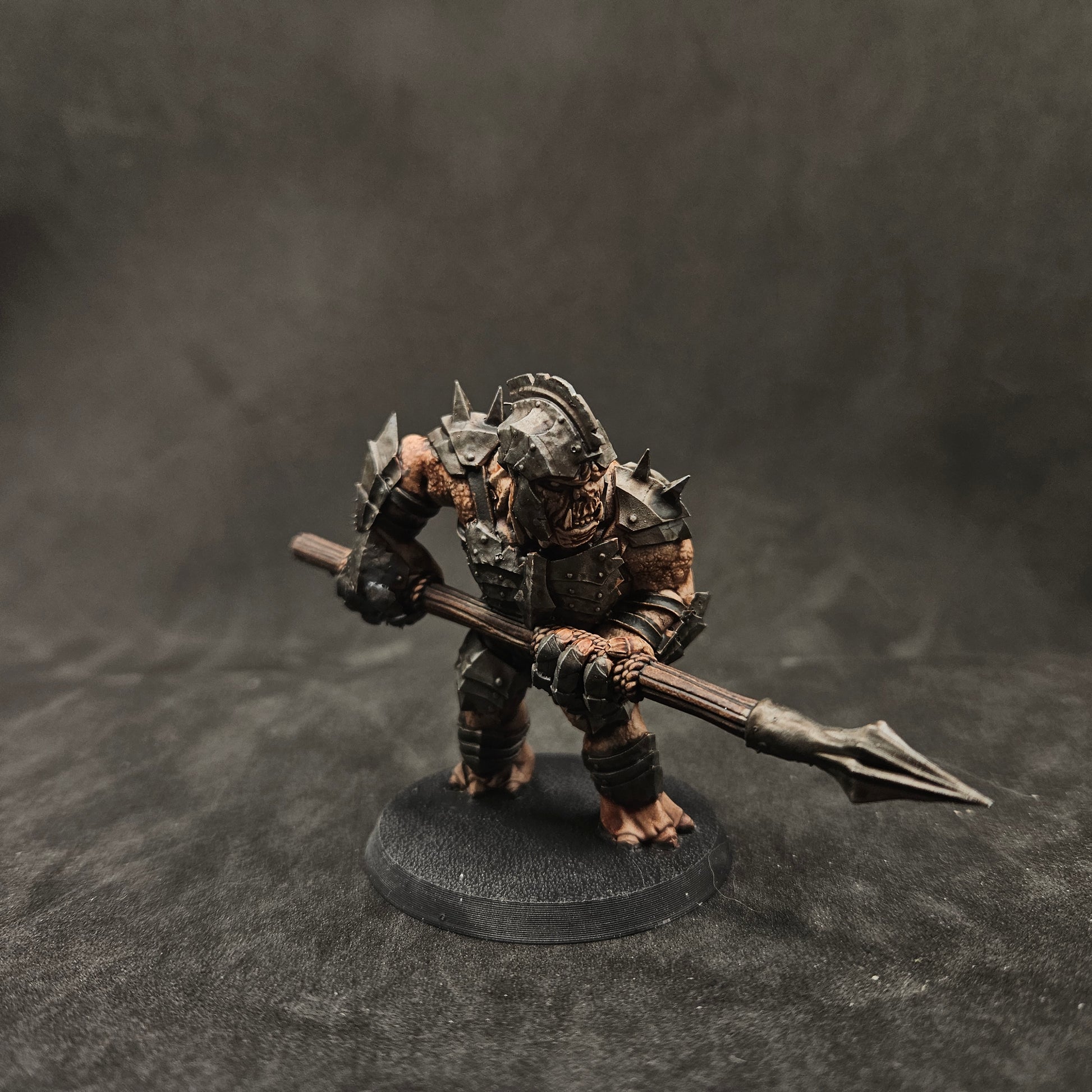 An Armoured War Troll with Spear printed at 28mm scale in resin, perfect for a certain fantasy setting following 9 adventurers on a quest to destroy a powerful magic ring.