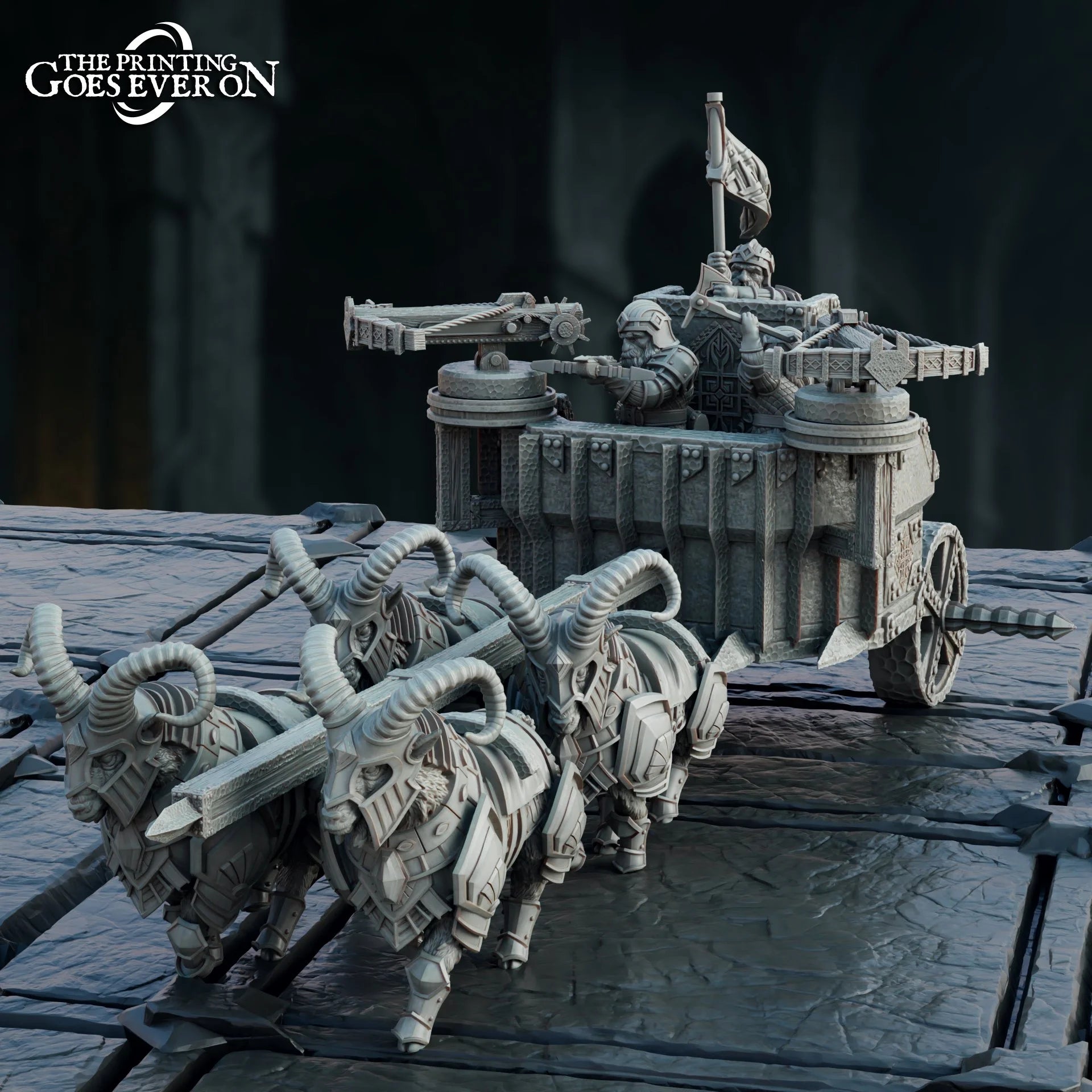 A Dwarven Chariot with 3 crew printed at 28mm scale in resin, perfect for a certain fantasy setting following 9 adventurers on a quest to destroy a powerful magic ring.