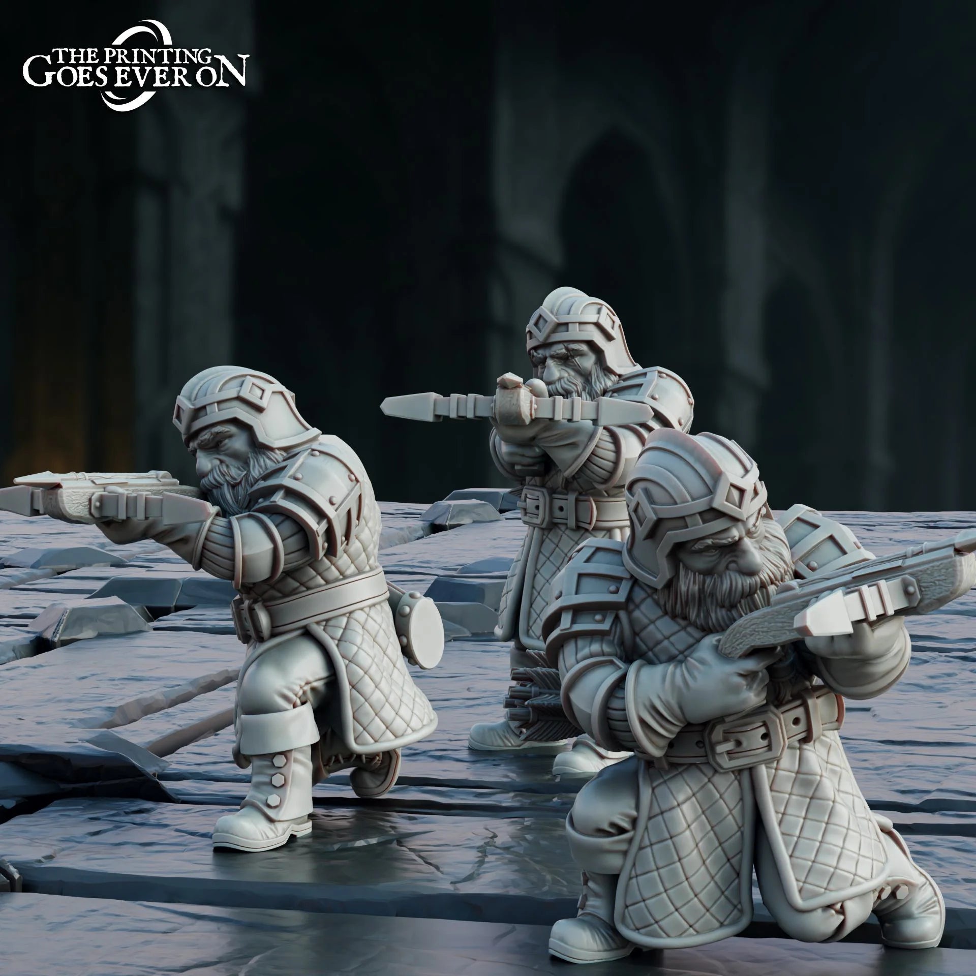 Three Dwarven Crossbowmen printed at 28mm scale in resin, perfect for a certain fantasy setting following 9 adventurers on a quest to destroy a powerful magic ring.