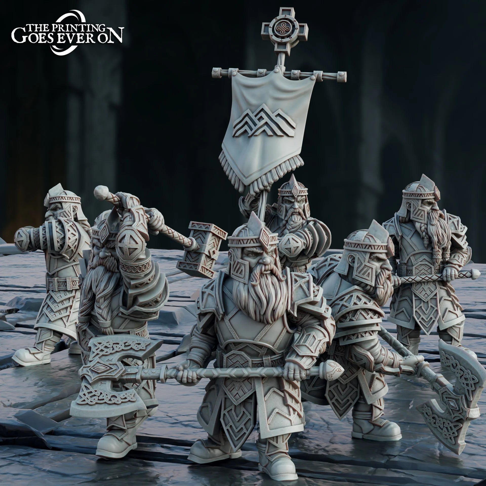5 Iron Vanguard and Bannerbearer printed at 28mm scale in resin, perfect for a certain fantasy setting following 9 adventurers on a quest to destroy a powerful magic ring.